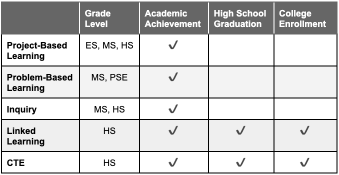 Summary of Evidence Base: AL approaches show strong evidence of improving academic and long-term outcomes across disciplines. Randomized controlled trials (RCTs) have demonstrated that project-based learning can improve academic performance in Advanced Placement courses, middle school science, and elementary science and literacy, for students from a range of prior performance and demographic backgrounds. A meta-analysis across nearly 100 observational studies shows problem-based learning can lead to gains in strategic thinking and the ability to design solutions to complex, real-world challenges. RCTs have shown that inquiry-based instruction can improve middle school math scores and understanding of statistics, as well as high school science proficiency. Experiential learning can boost outcomes through various formats, such as labs and service learning. Career and technical education and linked learning are linked to higher graduation rates, college enrollment, and earnings, particularly benefiting low-income and ethnic minority students.